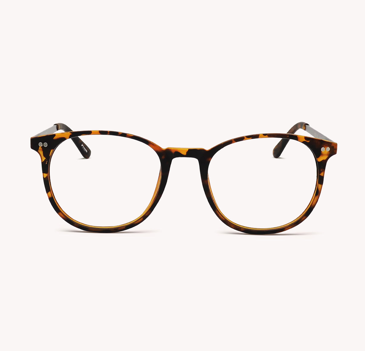 The modified round, shiny tortoise frame with light gold metal detailing suggests a chic and fashionable design that combines both aesthetics and functionality.